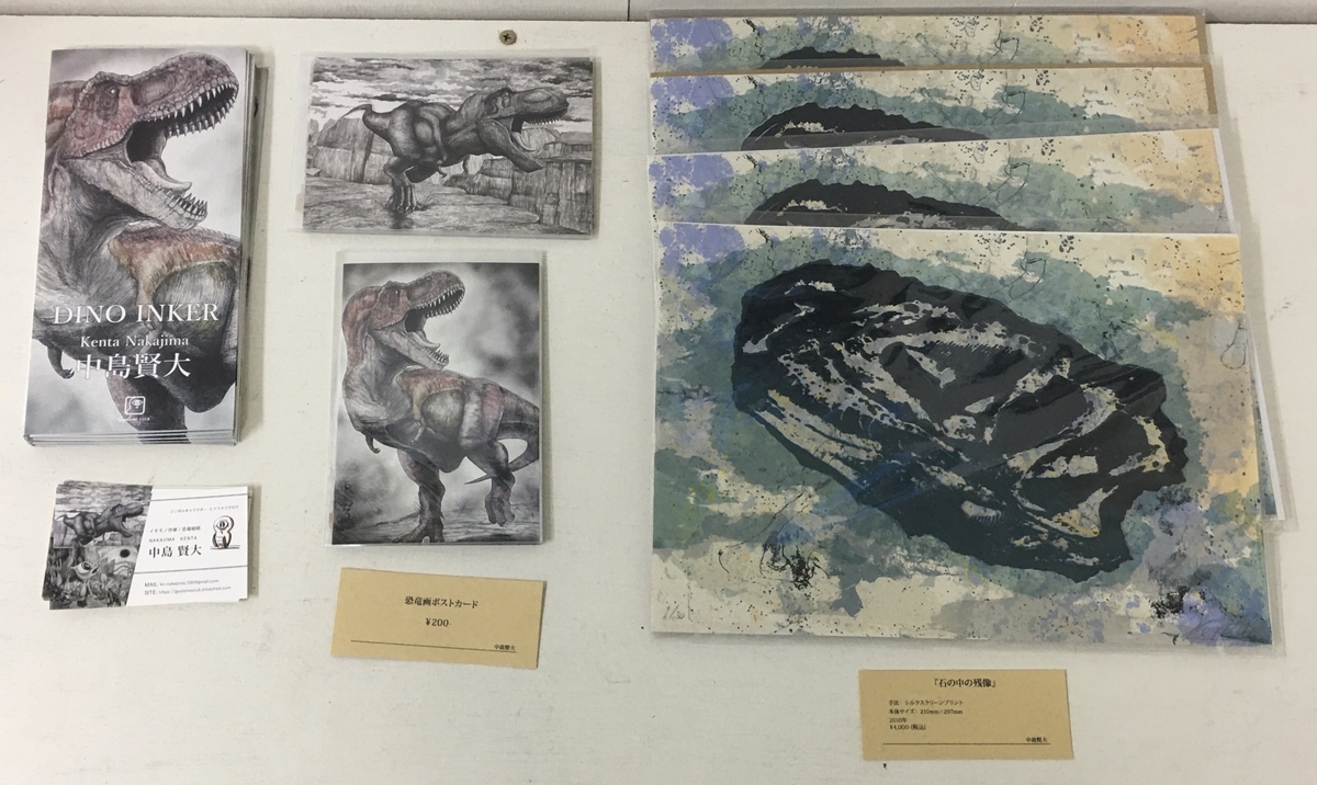 中島賢大さんのポストカードとシルクスクリーン作品。名刺とリーフレットも配布中。